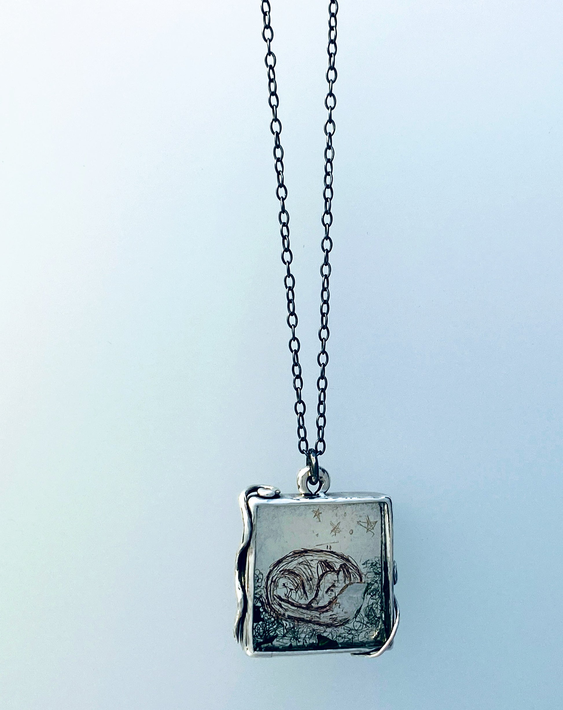 An etched vixen sleeps under the stars, moon gold leaf on glass, set in an embellished sterling silver setting with brass star detailing on the reverse.